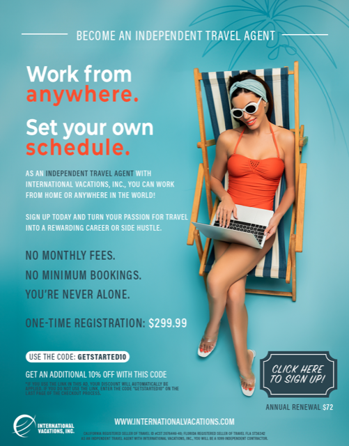 Turn your love of travel into a flexible income opportunity. Become a independent travel agent with International Vacations, Inc., a trusted host agency backed by experienced travel industry pros.